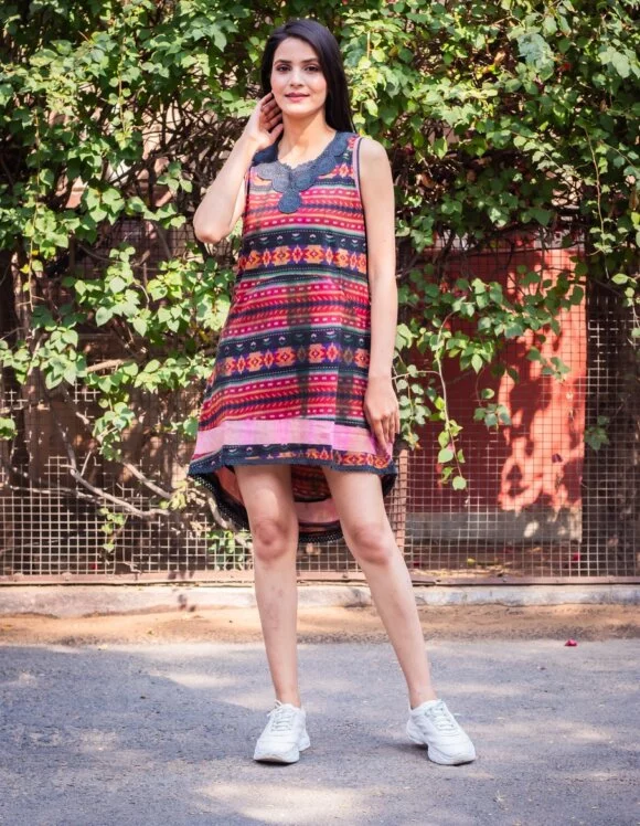 Stylish And Cool Moroccan Influence Printed Shibori Washed Short Dress Featuring Handmade Macramé Detailing