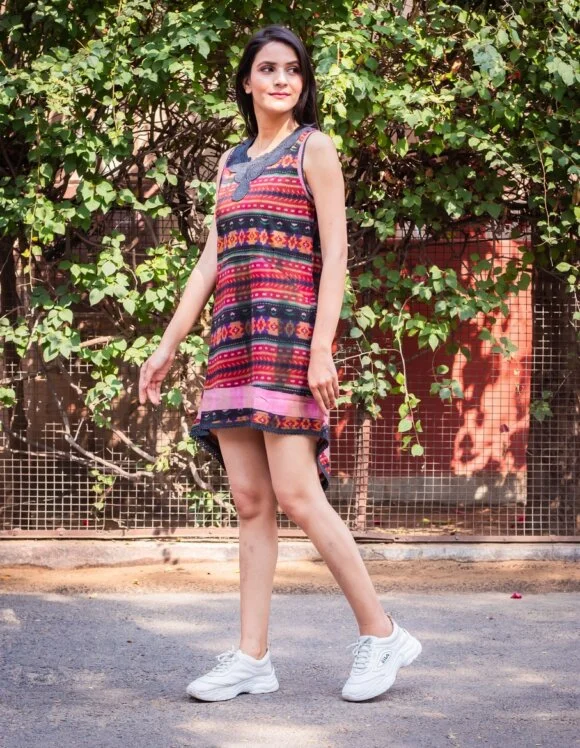 Visited By Happy Memories Of Monsoon 2023 Spanish Influence IKAT PRINT Bohemian Knit Dress Featuring Oversize Styling And Stylish Pockets