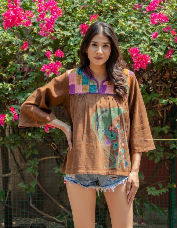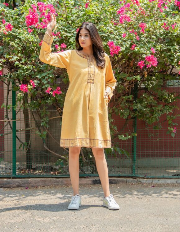 Sunday Brunch With My Besties Hand Block Printed Bohemian Tunic Featuring Mirror Hand Embroidery And Vegetable Dye