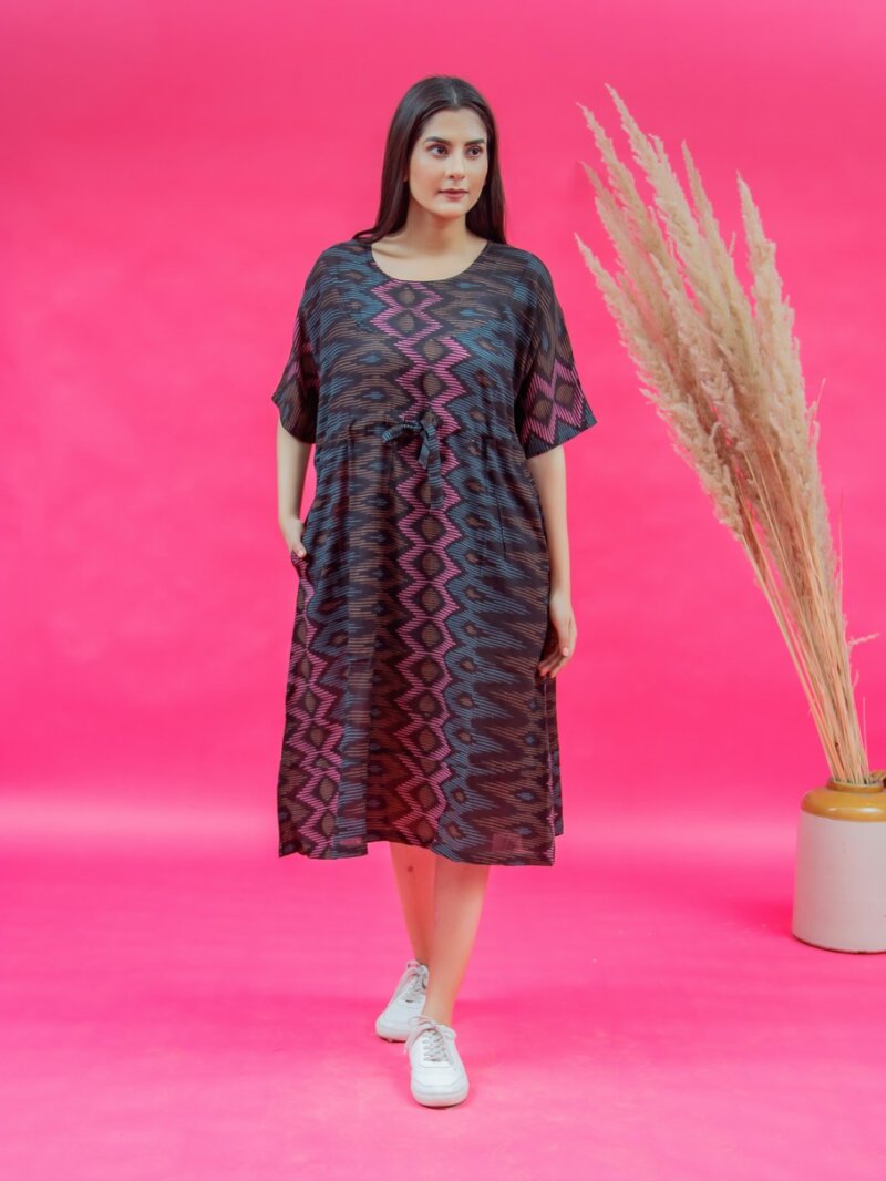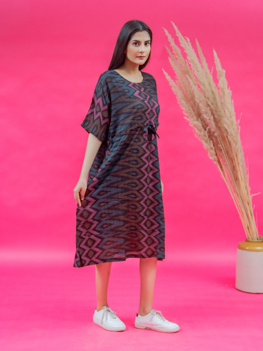A Pinch Of Bohemian Elegance Egyptian Influence IKAT PRINT Retro Dress Featuring Stylish Pockets And Oversize Styling