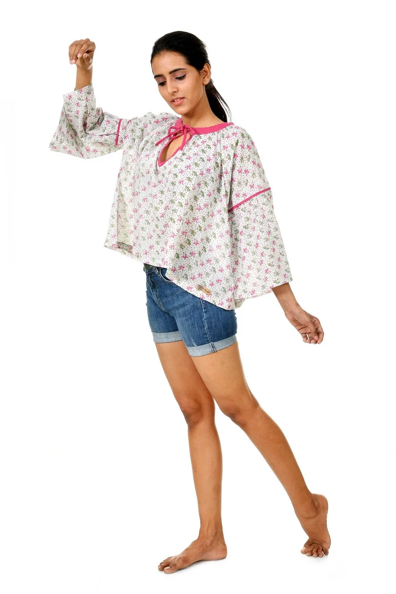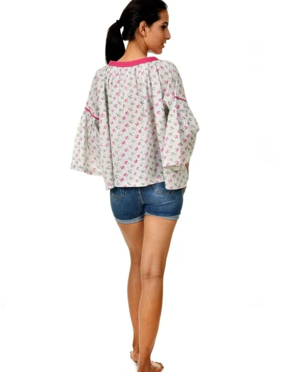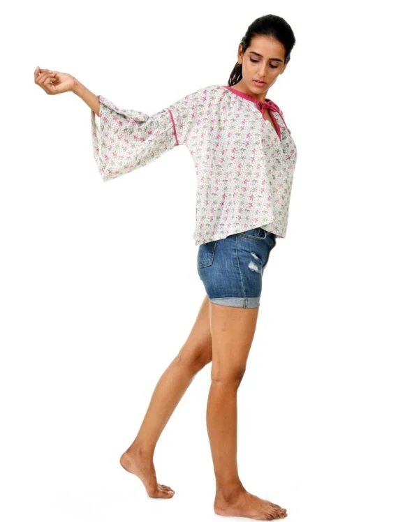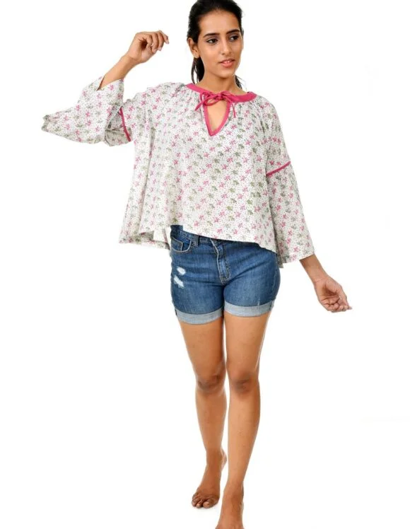 Get into this Beautifully Crafted oversize Blouse from Art Nouveau to experience the luxury of comfort. Featuring breezy cotton fabric with cute seed print on a pastel Blue base- This ensemble has all the spies to delight your day.