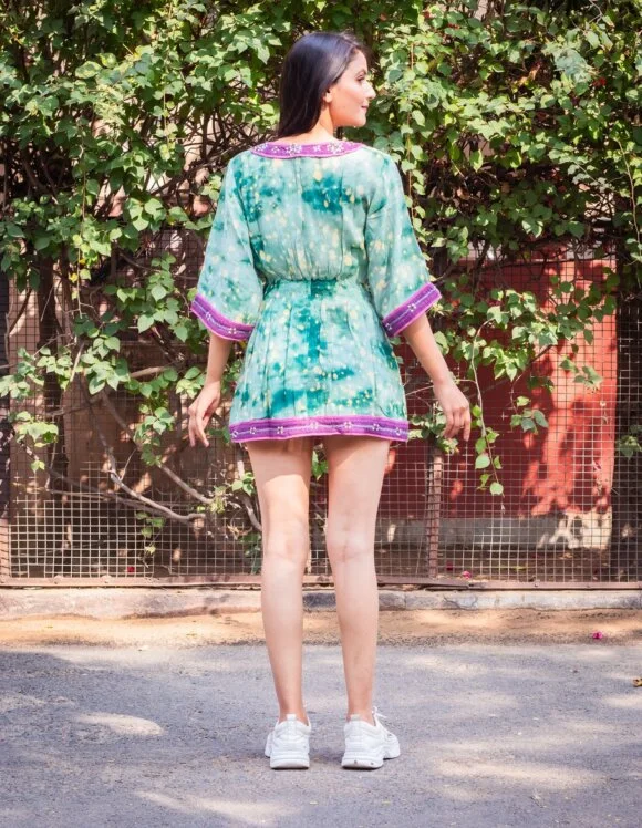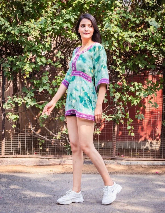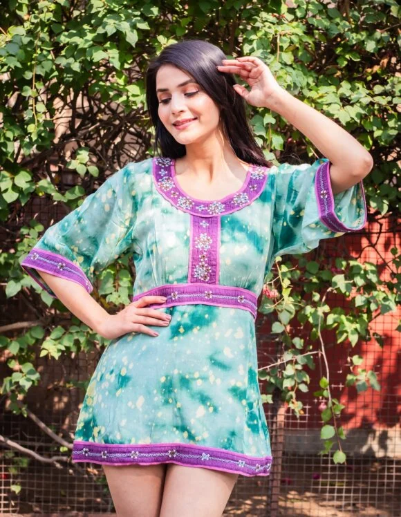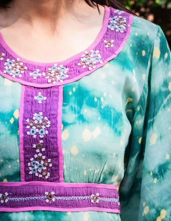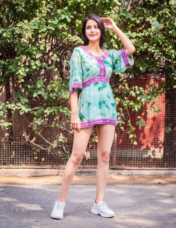Beaming Like A Shining Sun Moroccan Influence Shibori Washed Retro Short Dress Featuring Beautiful Hand Embroidery