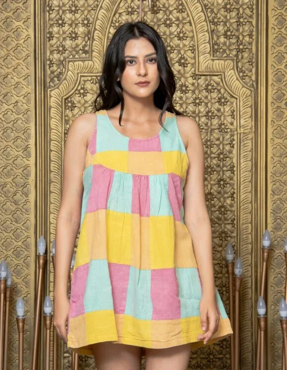 Casting Elegant Retro Shadows South American Influence Colourful Patchwork Retro Dress With Pockets