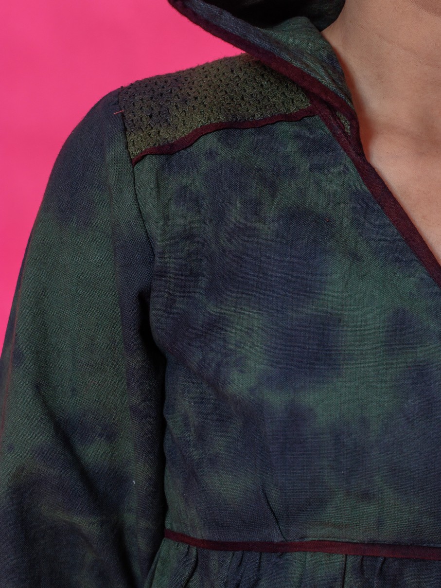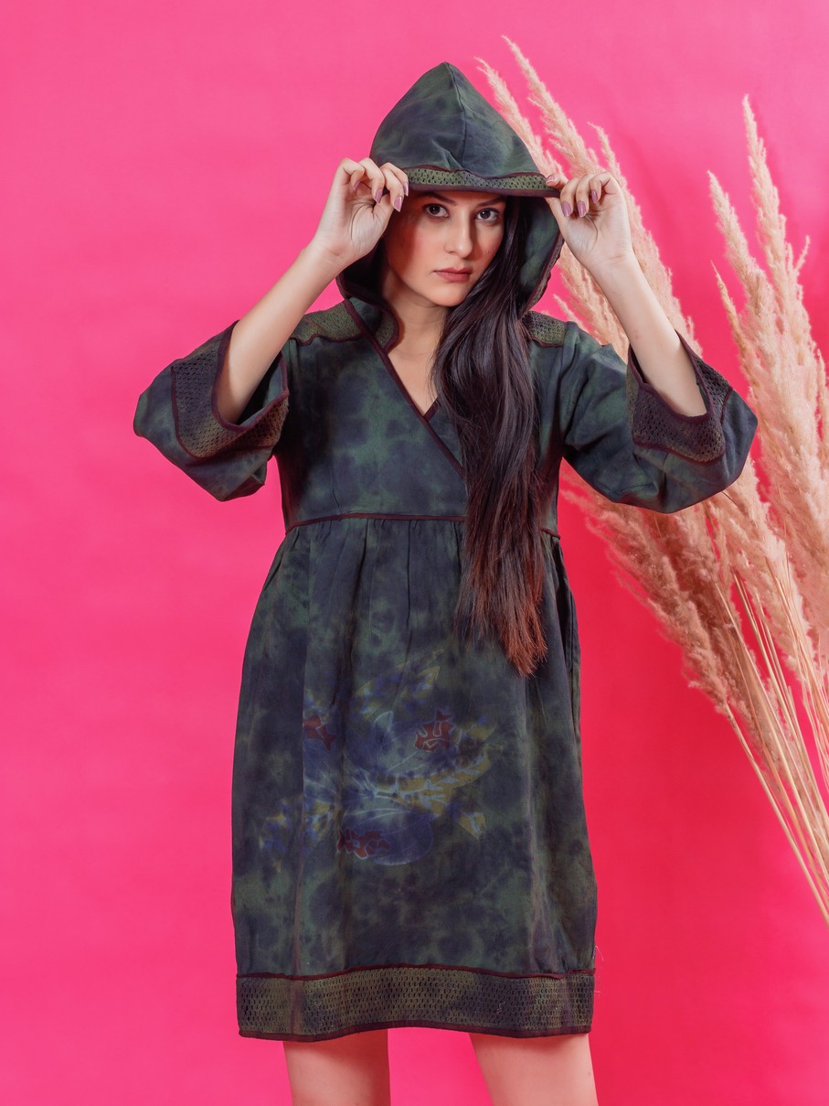 Countryside Vacay Of Fun And Laughter South American Influence Muted Floral Print Motive Bohemian Hooded Dress Featuring Shibori Wash And Hand Woven Macramé