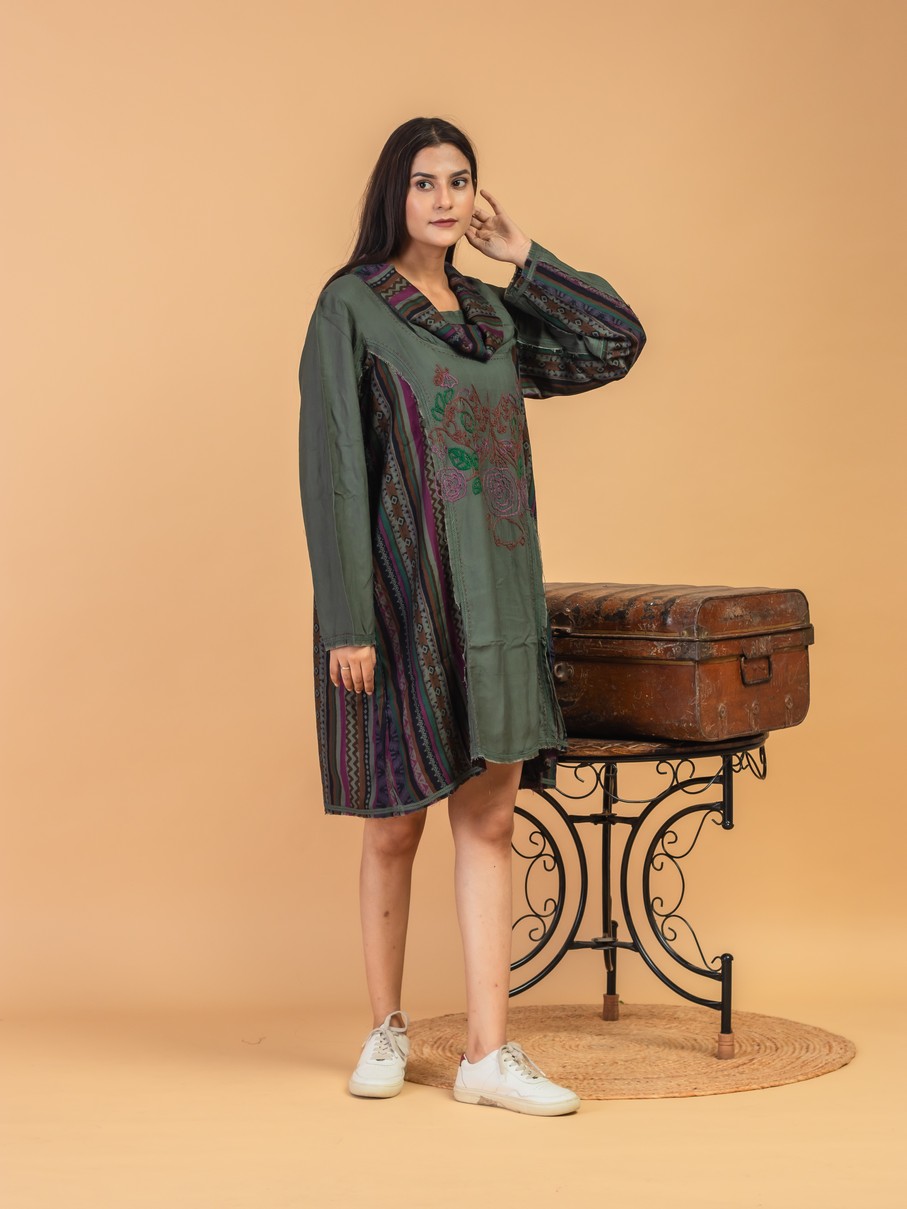 Midnight Jog At Central Park Spanish Influence BOHEMIAN Hand Embroidered Dress Featuring Geometrical Print And Roll Over Collar