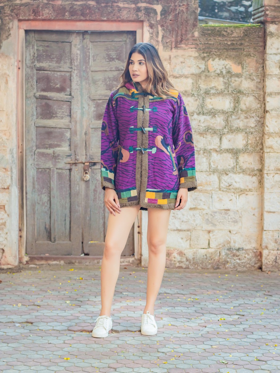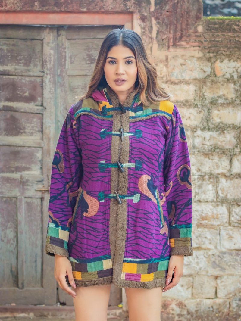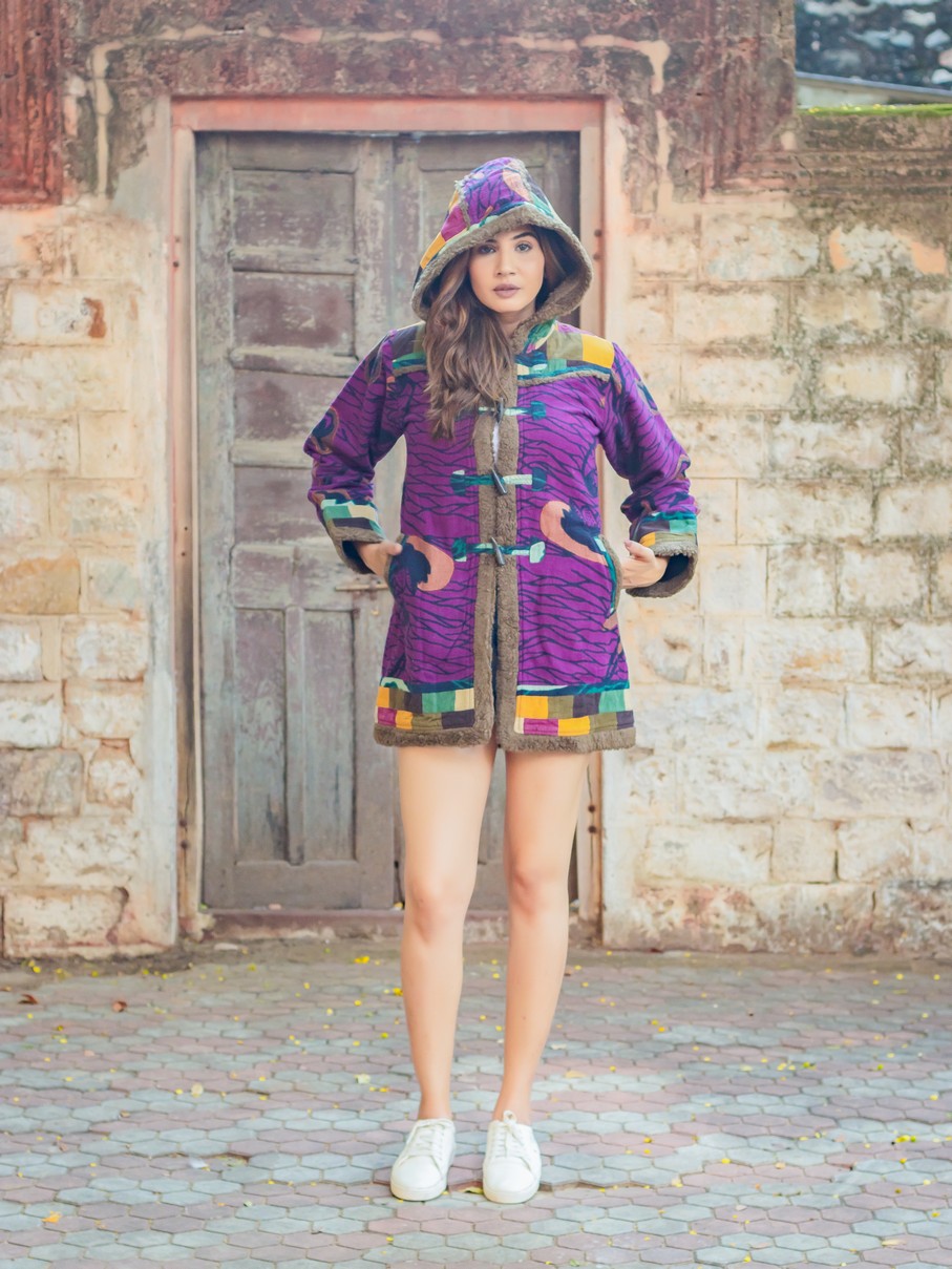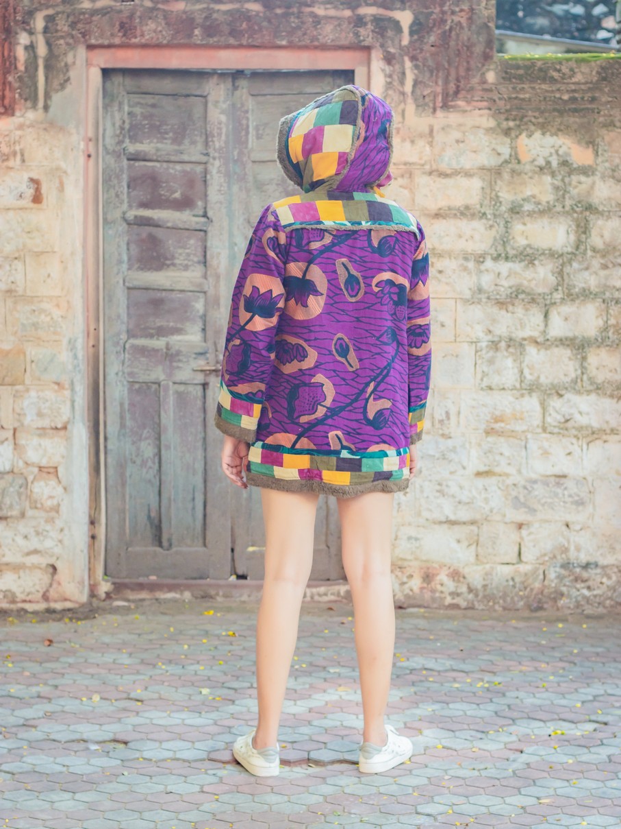 Midnight Trip To The City Movie Hall South American Inspired Bohemian WARM Quilted Jacket Coat Featuring Lotus Print And Colourful Corduroy Patchwork With Stylish Hood