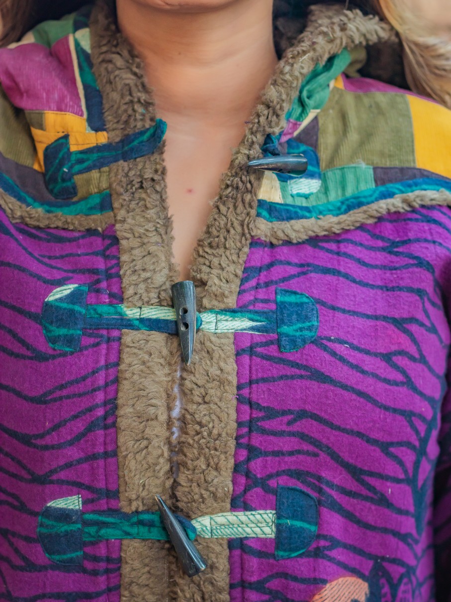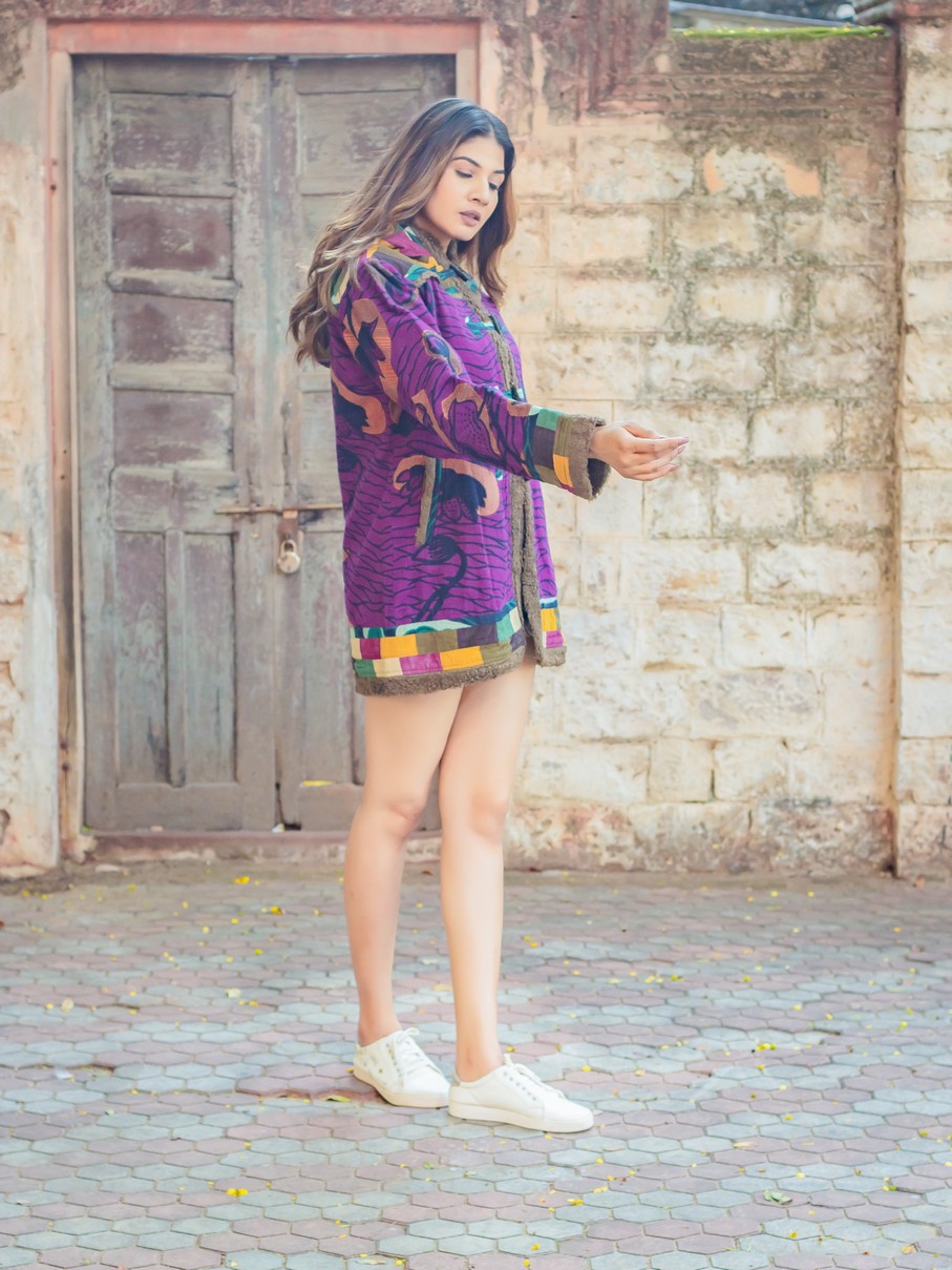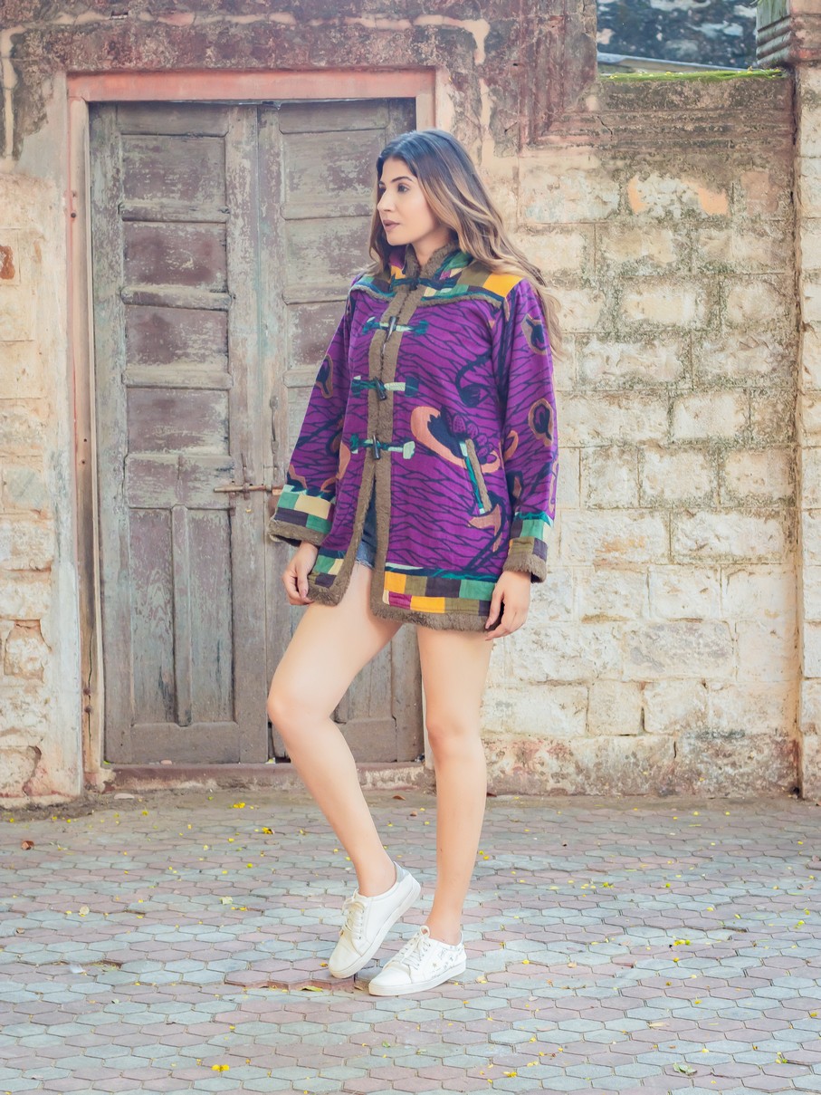 Midnight Trip To The City Movie Hall South American Inspired Bohemian WARM Quilted Jacket Coat Featuring Lotus Print And Colourful Corduroy Patchwork With Stylish Hood