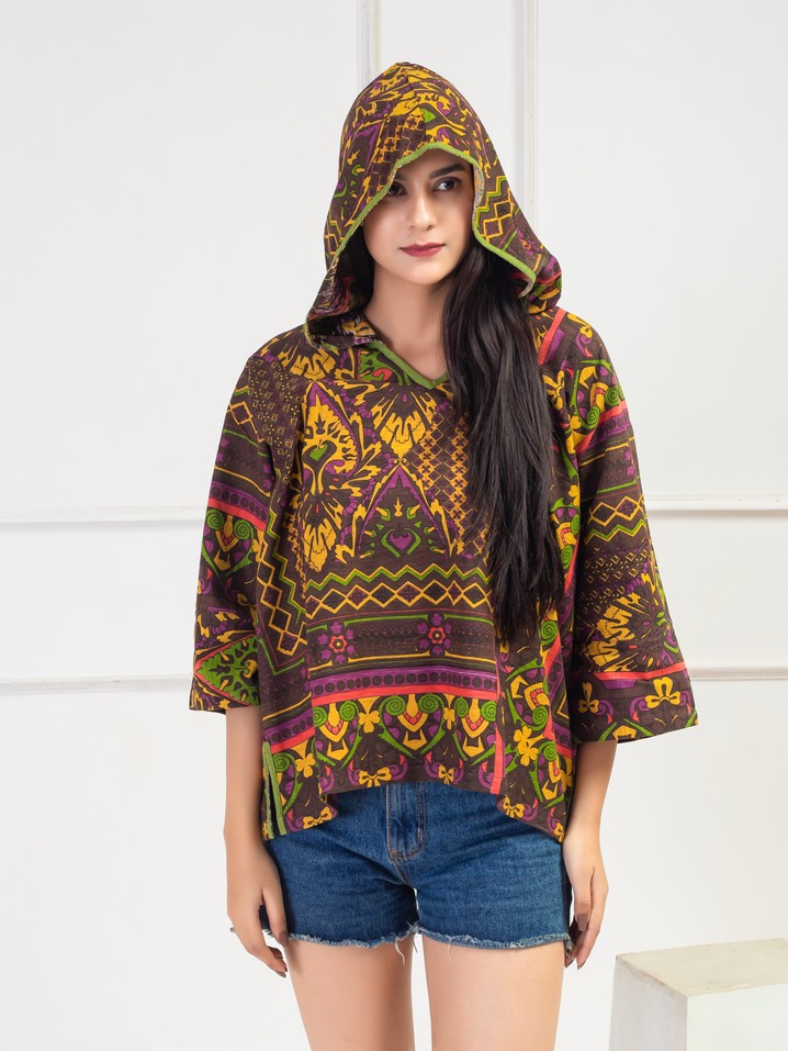 Off To The Fun Weekend At Ibiza Spanish Influence Retro Pullover Featuring Bohemian Print And Stylish Hood