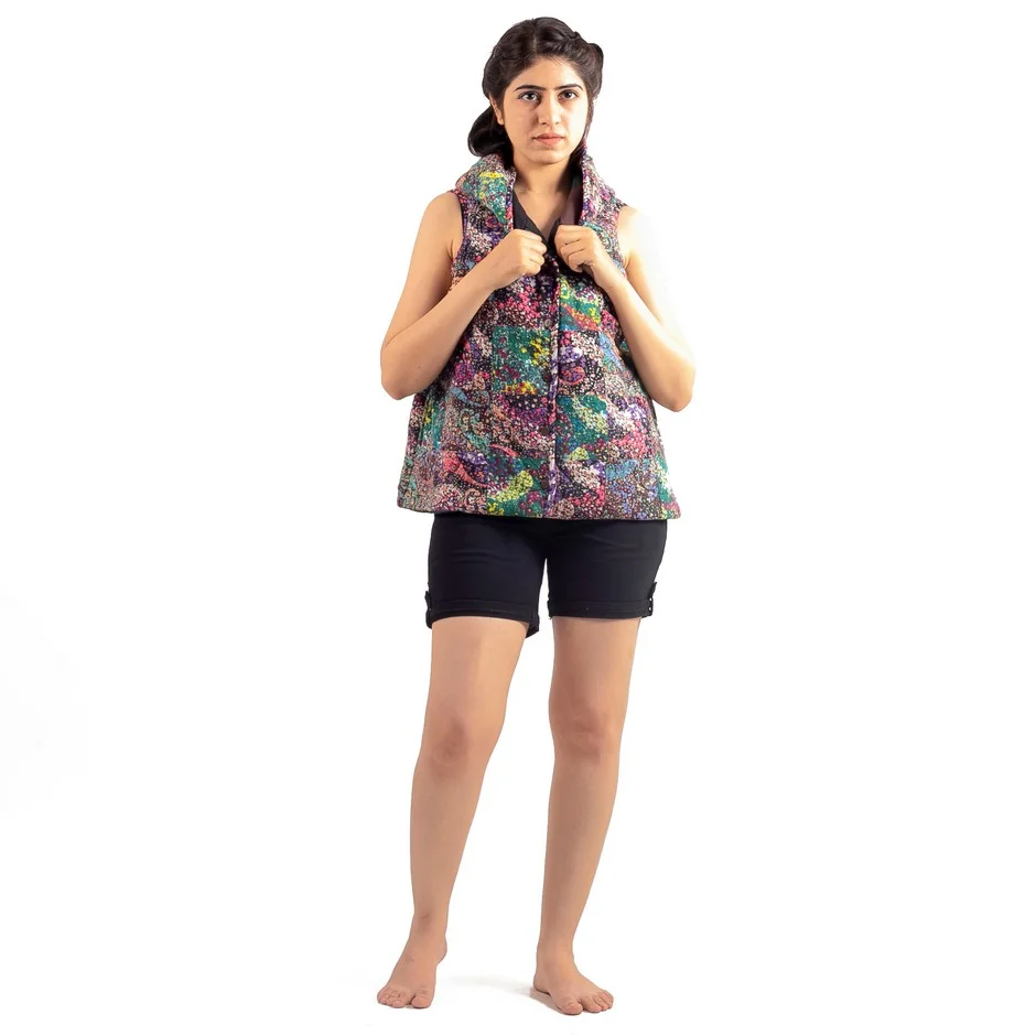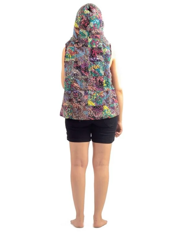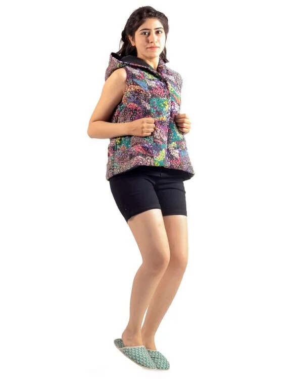 This soft patchwork Jacket vest goes best with a deep breath of fresh air! From Art Nouveau Team, this Multi color cotton quilted warm outerwear features all the requirements of an adventurous outfit – a warm quilted hood with green hue quilted lining, side pockets, easy to wear front button opening. It’s clear from this cute cotton quilted jacket that you’re quite fond of your surroundings!