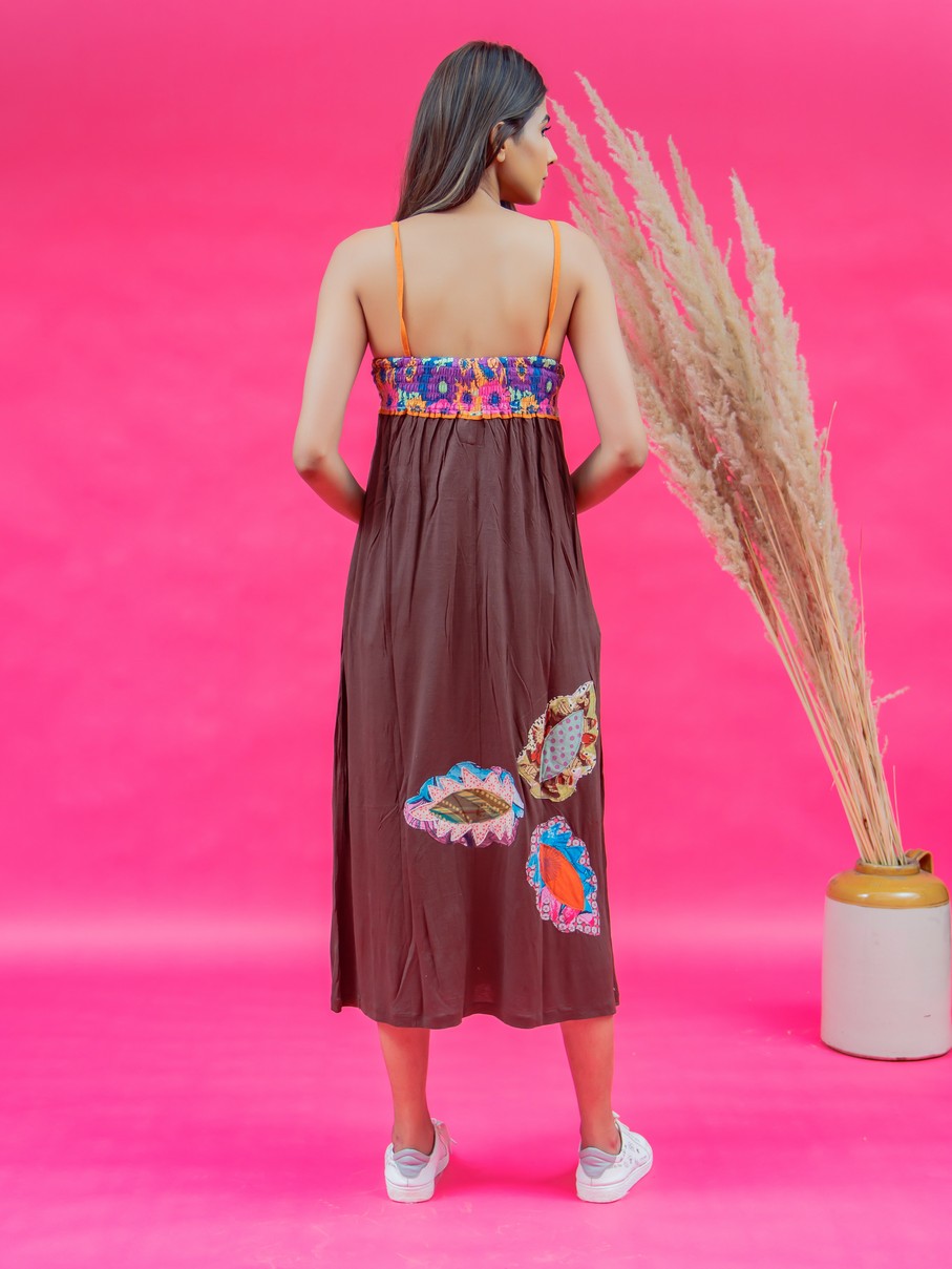 Pleasant Summer Confidence Spanish Influence Floral Print Detailed Bohemian Knit Dress Featuring Colourful Appliqué Work