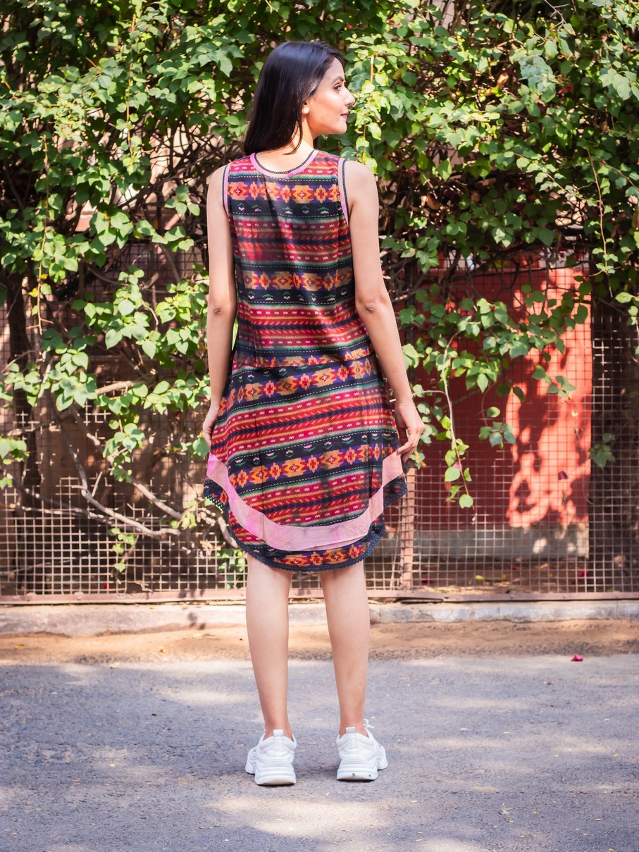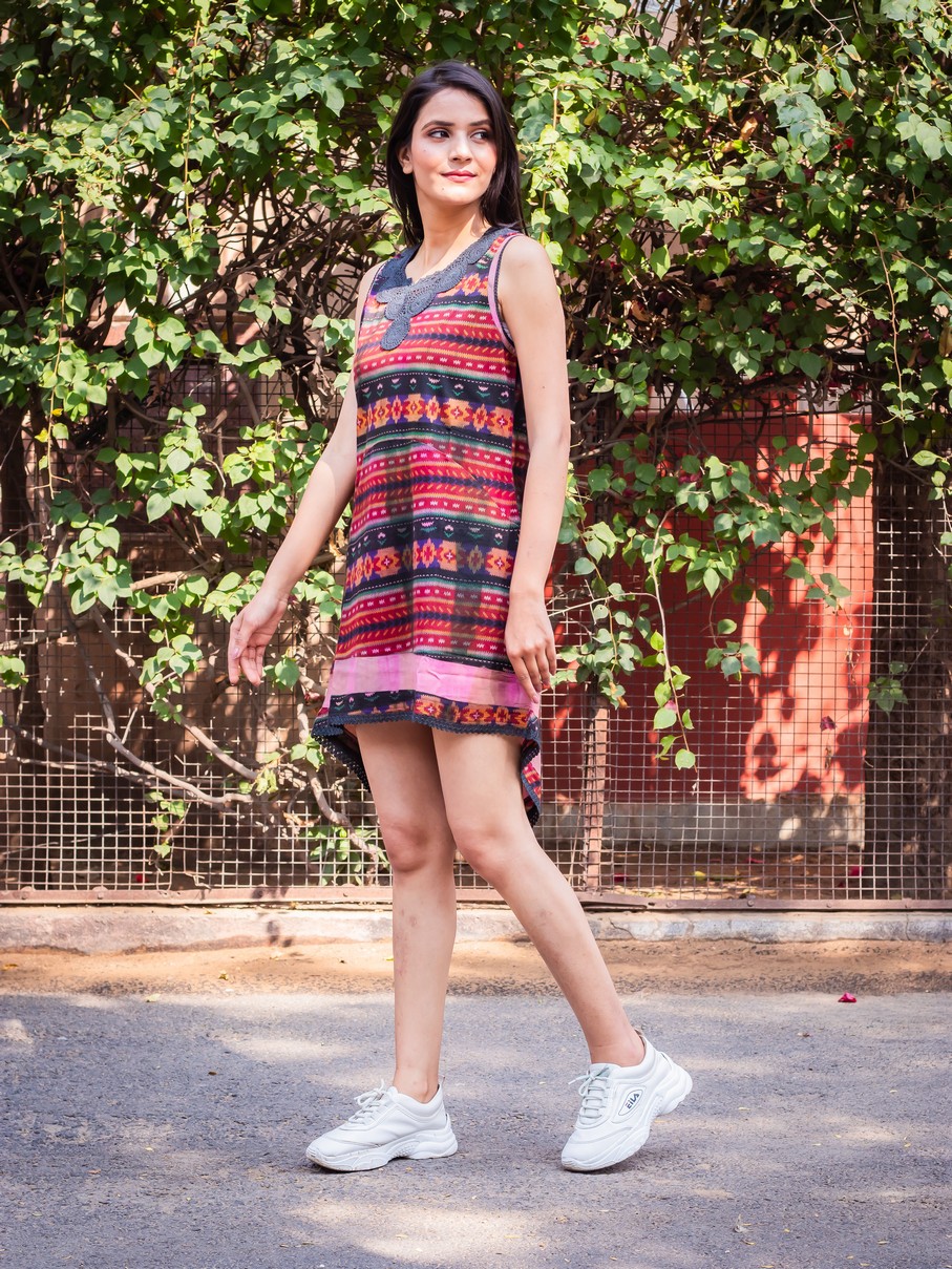 Stylish And Cool Moroccan Influence Printed Shibori Washed Short Dress Featuring Handmade Macramé Detailing