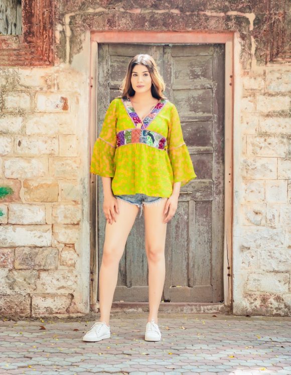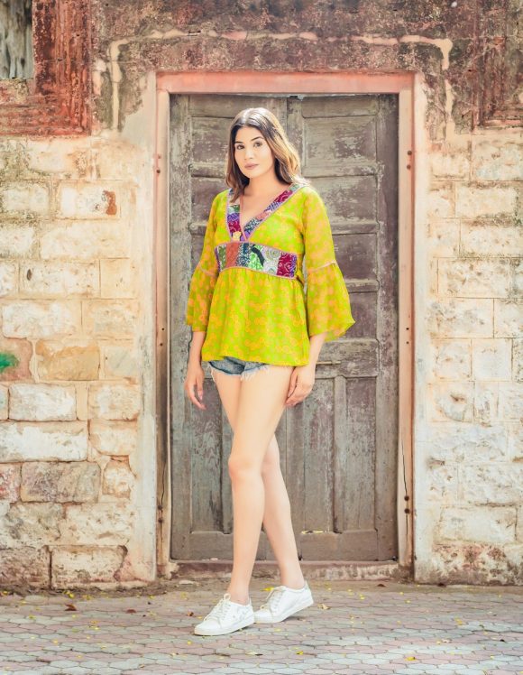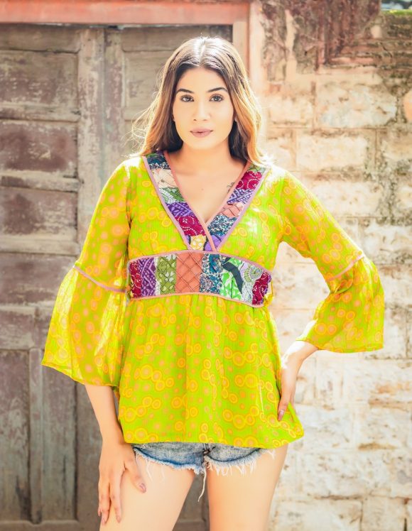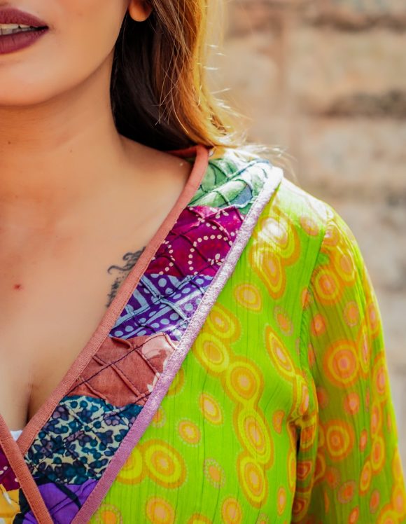 Sure To Be Happiness Blessed French Influence Fully Patchwork Detailed Chiffon Pullover Featuring Psychedelic Geometrical Print