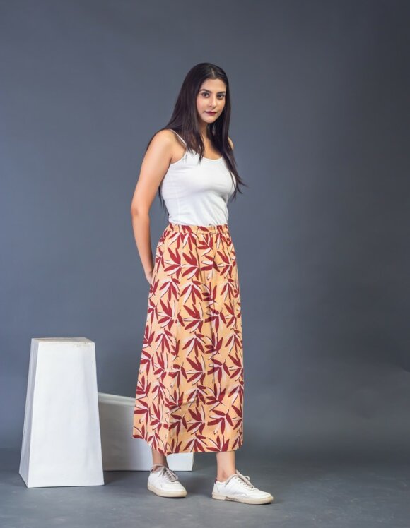 Weekend At Bahamas South American Influence Bohemian Skirt Featuring Leaf Print And Handmade Drawstrings