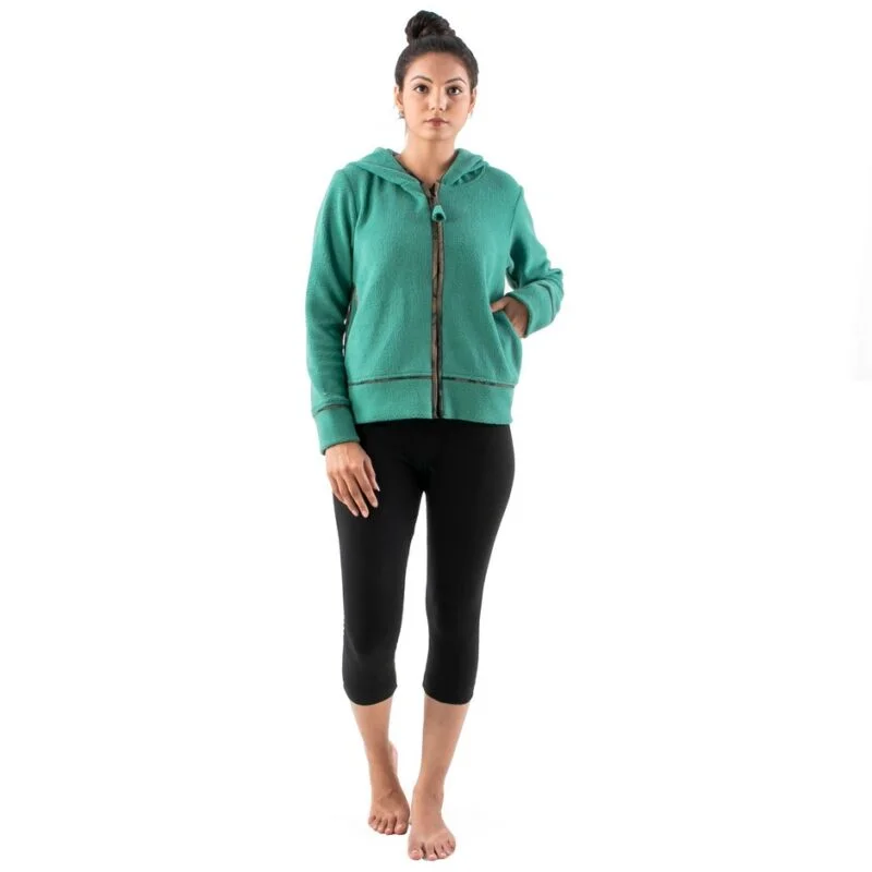Going out for having Wintertime snacks? Then get ready by having ON Art Nouveau exclusive Fleece Jacket in moss green colour. The amazing details like front zipper, cozy hood, side pockets & print piping are a sure treat for your Fashion aesthetics.